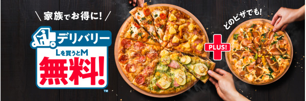 サービス内容:デリバリーで「Lサイズ」のピザ1枚購入につき、期間限定品を含むお好きな「Mサイズ」のピザ1枚が無料になります。