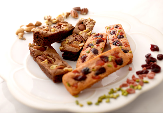 昨年の発売以来、ご好評をいただいているオンラインショップ限定のブラウニーに数量限定でルビーチョコレートを使用した淡いピンクのブラウニーが登場。ルビーチョコレートのフルーティーな味わいを引き立たせるために、いちごとクランベリーのドライフルーツとピスタチオをのせて焼き上げました。淡いピンクの生地にベリーとピスタチオで彩りを添えて、芳醇なチョコレートとナッツが香ばしい定番のブラウニーとセットでご用意しました。