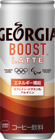 こうした背景から、このたび「ジョージア」発となる、カフェラテの味わいがありながらエネルギー補給もできる「ジョージアブースト」の発売に至りました。コーヒー由来のカフェインに加えて、ビタミンB6、アルギニンを配合して、ほどよい甘さとミルクとのバランスもよく、すっきりとした味わいに仕上げています。
