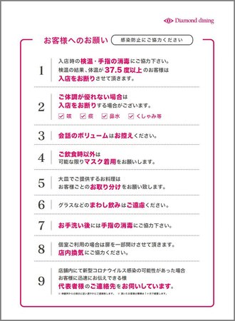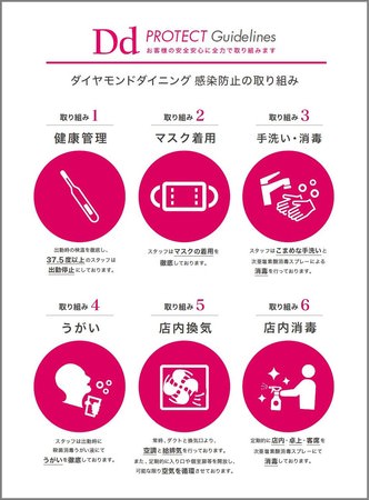 ダイヤモンドダイニングが運営する各店舗では、お客様に安心してお食事を楽しんでいただくため、行政が定める方針に基づいた感染防止対策を最大限に講じ「Dd PROTECT Guidelines」として実施しております。