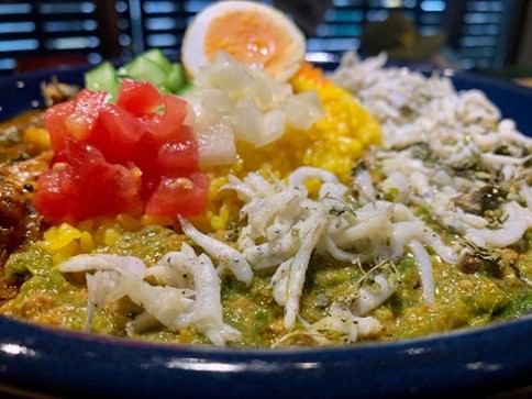 タンパク質とカルシウムの豊富な釜揚げしらすがたっぷり入る見た目も鮮やかなカレー。卵、トマト、ニンジン、キュウリ、玉ねぎがトッピングされて、ヘルシー志向の女子にはたまらない一皿だ。青海苔がふんだんに入ったグリーン色のキーマカレーと釜揚げしらすの組み合わせは体験必須!