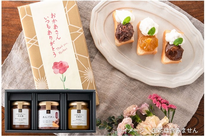 ご飯よりパン派!甘いものには目がない!そんなお母さんにぜひおすすめなのが「和ジャム3本ギフト」。大人気の「あんバター」と「渋皮栗」「安納芋」のジャムを詰め合わせました。北海道産の小豆を使用し、バターをたっぷりと加えて仕上げたあんバターはパンのお供にぴったり。パンの他にもお餅やアイスクリームに合わせても相性抜群です!