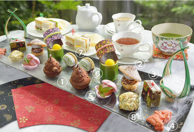 「和紅茶のチーズケーキ」は、“ぶんぶくちゃがま”でタヌキが化けた茶釜をかたどった見た目にもかわいらしい一品。焦がしバターの香ばしさと、まろやかな和紅茶の風味が広がります。竹の中から“かぐや姫”が登場する場面をイメージした「白みそブランマンジェと醤油ジュレと帯チョコ」は、麹の甘みが特徴の白味噌と醤油との甘辛いコクが絶妙な味わいです。傍らには笹模様の「ピスタチオマカロン」を添えています。そのほか、煎茶のスコーンやサンドイッチなどの軽食もお楽しみいただけます。