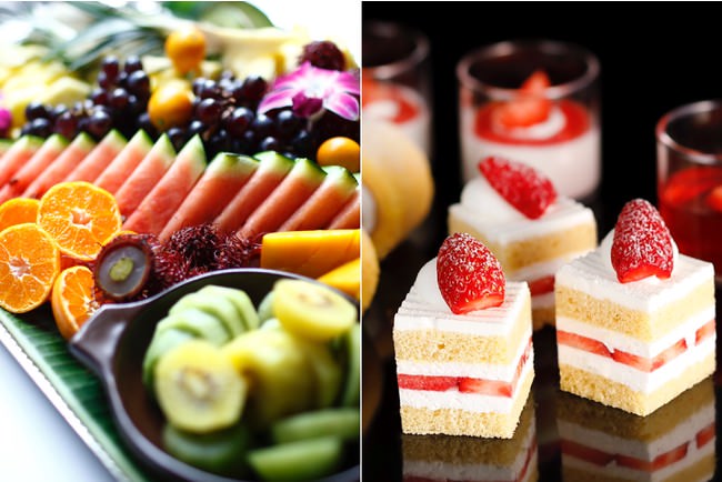 パティスリーSATSUKI『スーパーあまおうショートケーキ』を含む、全6種の人気スイーツがビュッフェサイズでラインアップ。さらに、トレーダーヴィックスオリジナルスイーツ、フレッシュフルーツの盛り合わせまで、大充実のスイーツコーナーもお見逃しなく。