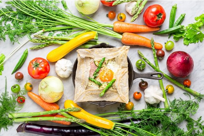フランス・ブルターニュ地方発祥の郷土料理“そば粉のガレット”。自然豊かな中国山地の清らかな水で育った広島県産のそば粉を使用し、外側はパリッとして、噛めばモチモチとした食感が楽しい一品です。抗酸化物質ポリフェノールの1種のルチンや必須アミノ酸、ビタミン、食物繊維など多くの栄養素を含んだそば粉のガレットに、5月から6月にかけてが旬のグリーンアスパラガス、ちよだの卵、ハム、ズッキーニや茄子などの広島県産野菜を日替わりでトッピングします。