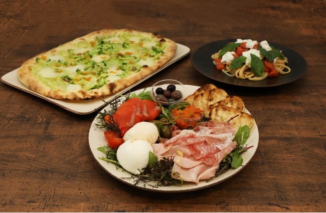アンティパストミスト”バッボ”、サルディーニャ産からすみとブロッコリーのピッツァ、水牛モッツァレラチーズとチェリートマトの冷製パスタ ”バベッティーネ”