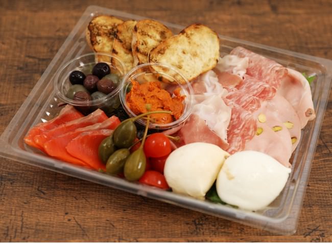 水牛モッツァレラチーズ2種、イタリアンサルーミ3種、 激辛サラミペースト ”ンドゥイヤ”、 メルバートースト、 フレッシュオリーブ、 ケッパーベリー、 ワイルドサーモンのスモーク