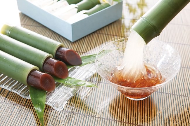 青竹風容器に入った、滑らかな口当たりの水羊羹。