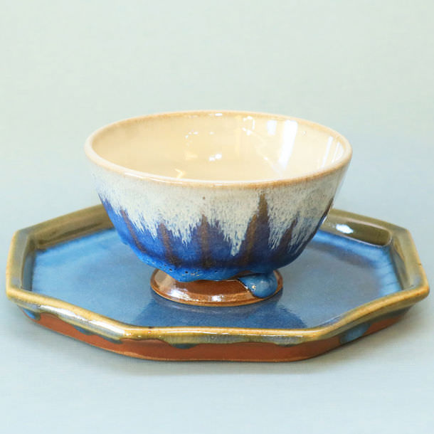 地元で採取した土、青さが際立つ海鼠釉(なまこゆう)、職人による手作り、大仙市で最古158年の歴史を持ち、伝統と技術を守る楢岡焼をかき氷の器に使用しています。