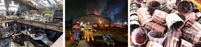 2021年5月24日にカヌレ自社工場が全焼しました。死傷者が出なかったことが不幸中の幸いですが、工場建屋に加え、オーブンやミキサー、急速冷凍庫など、すべてが焼け落ちてしまいました。開発からこだわった銅のカヌレの型は、すべて熱で変形し、使用することができません。現在、カヌレの製造が進められず、多くの御取引先にご迷惑をおかけしておりますことを心よりお詫び申し上げます。