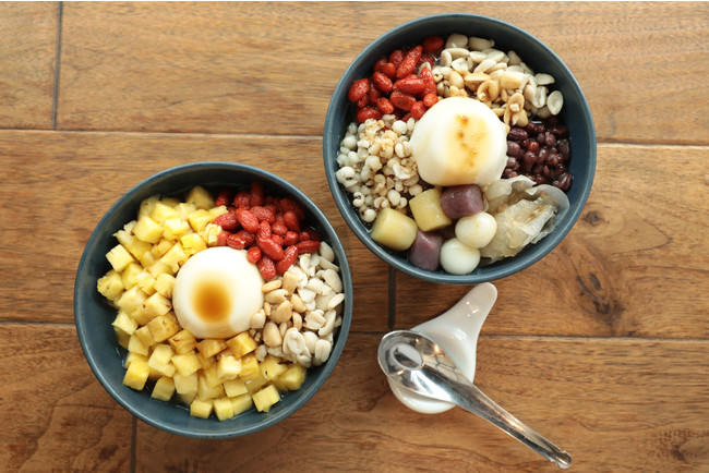 このたび、夏季限定スペシャルスイーツとして登場するのは、「富錦樹八賓冰(バーバオピン)」、「杏仁鳳梨冰(杏仁パイナップル氷)」の2アイテム。「富錦樹八賓冰」は、自家製芋ダンゴ、白玉、あずき、ピーナッツ、杏仁豆腐など8種類の具材を、きび糖氷の上に贅沢にトッピング。身体の火照りを鎮めるほか、栄養も豊富で、上品な甘さを楽しめる、まさに夏にぴったりな一品です。また、「杏仁鳳梨冰」は、その名の通り、ジューシーなパイナップルのほか、クコの実、ピーナッツ、杏仁豆腐をトッピングしたきび糖氷で、スッキリした甘さが爽やかさを演出します。