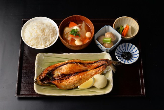福島県いわき市小名浜の脂が乗った身厚な「伴助」の干物とふっくら炊き上げた福島県産こしひかり、具だくさんの味噌汁や板前こだわりの小鉢を定食スタイルでご提供いたします。