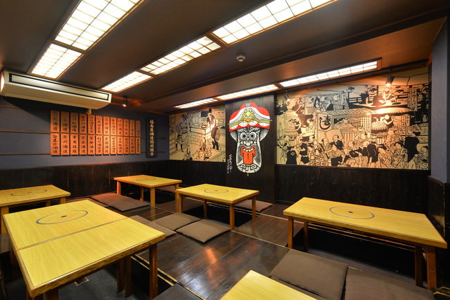 また、日本の伝統工芸を守りたい思いから工芸家である会津商家「竹藤」の許諾の元、会津の唐人凧のモチーフを店内に描き出し、多くの方に伝統工芸の存在を知ってもらえるよう江戸の料理屋の世界観を演出しています。