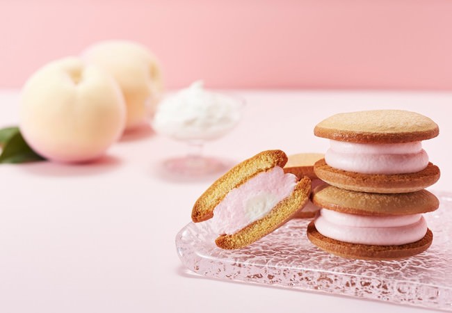 岡山県産の清水白桃ピューレを使用したとろけるような甘みのクリームと、ホイップクリームをサンドしました。
