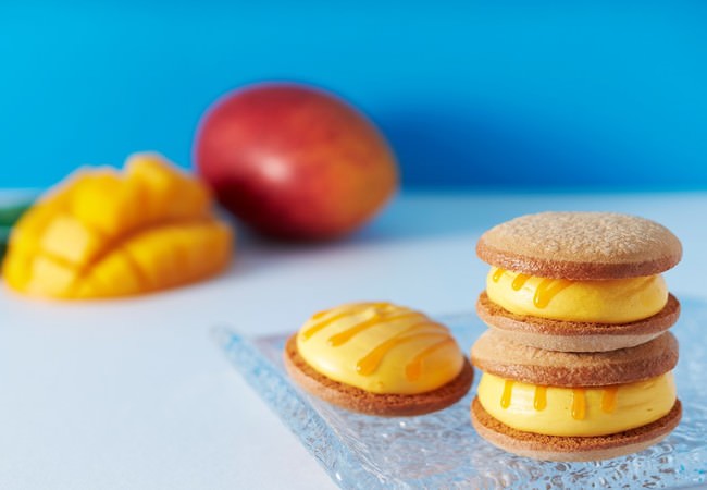 宮崎県産のマンゴーピューレを使用した濃厚な甘みのマンゴークリームとマンゴーソースをサンドしました。盛夏にふさわしいトロピカルな味わいをお楽しみください。