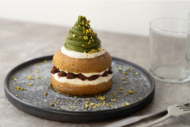 2種類の味が楽しめるイートイン限定の「ドーナツメルト」は、日本茶とミルクティーを染み込ませたドーナツに、ザクザクのクランブルやマスカルポーネクリームをトッピングし、日本茶のモンブランクリームをたっぷりと絞りかけました。ドーナツ生地には、YUGENの京都産宇治抹茶、京都産玉錦ほうじ茶とMILK TEA SERVICEのセイロンブレンドを使用。日本茶の風味が口に広がりながらも、後味はミルクティーを感じられ、トッピングのモンブランクリームが程良い甘さで包み込んでくれるドーナツです。
