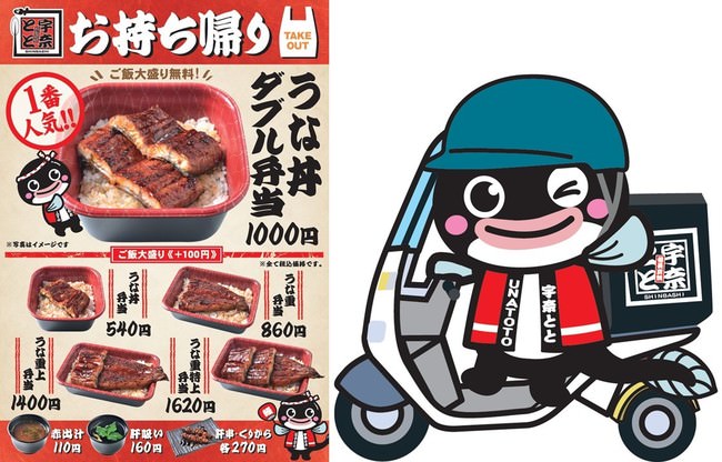 メニューは、1杯550円(税込)という鰻の常識を打破した宇奈ととの代名詞「うな丼」、鰻が2枚のって人気No.1の必食メニュー「うな丼ダブル」、鰻料理の定番「うな重」などで、デリバリーの場合優しい出汁の風味と希少な肝を味わえる「肝吸い」、柴漬けが付いたセットでご提供しております。