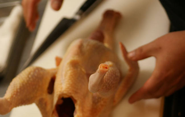 2.生産責任者から仕入れる鮮度抜群の丸鶏一羽をお店で丁寧に捌く