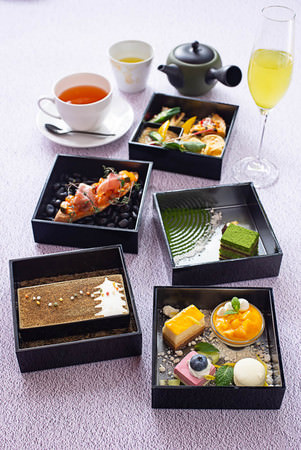 八坂の塔をイメージした五段のお重でご用意するスイーツや軽食は、アカガネリゾートのパティシエが丁寧に作った自慢のラインナップ。