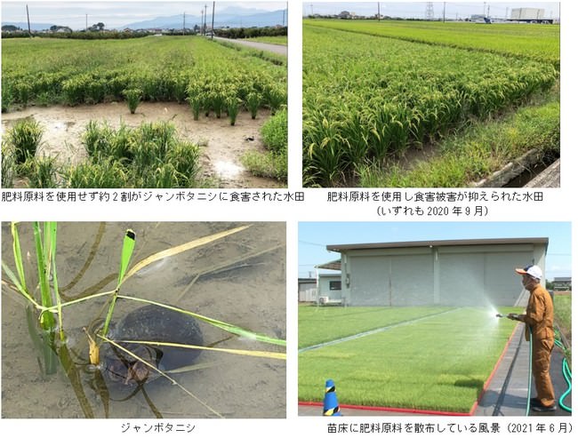 2020年6月、岐阜県瑞穂市の約5haの水田に、田植えに合わせて「ビール酵母細胞壁」由来の農業資材(肥料原料)を使用したところ、隣接する肥料原料を使用しなかった水田の約2割の稲がジャンボタニシの食害被害があったのに対し、使用した水田では食害された稲はほとんど見られませんでした。