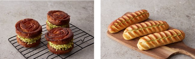 「クイニーアマン ピスタチオクリーム」は、ミニサイズに焼き上げた定番人気の「クイニーアマン」で、自家製ピスタチオクリームをサンドする一品。また「ヴィエノワ ピスタチオクリーム」は、表面に美しいクープ(切れ込み)の入ったヴィエノワ生地に、自家製ピスタチオクリームを絞り入れてお楽しみいただけます。