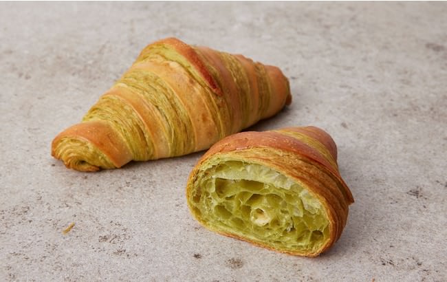 ナッツの女王「ピスタチオ」を使用した、プレミアムなクロワッサン。カリフォルニア産ピスタチオペーストをふんだんに練り込んだ生地で、中心にホワイトチョコレートを巻き込み焼き上げました。