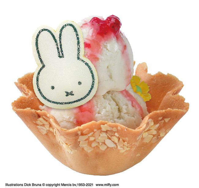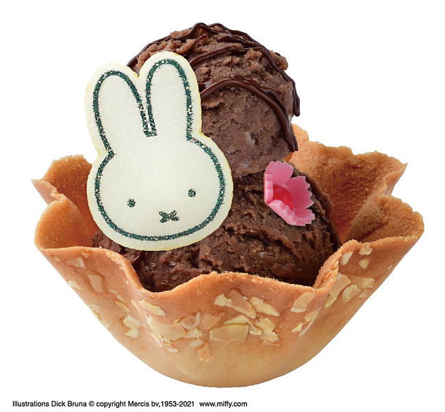 たっぷりとダブルでのったアイスクリームに可愛らしいミッフィーのもなかとお花のチョコレートを添えました。これからの季節に楽しみたい一品です。