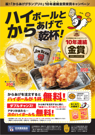 からあげグランプリⓇ10年連続金賞受賞を記念して、話題の「ハイから」文化をお客様にお楽しみいただきたいという想いから、お好きな「からあげ単品(6種)」または「3種MIX」のご注文で、各種ハイボール1杯プレゼントいたします。(一部対象外ハイボールあり)
