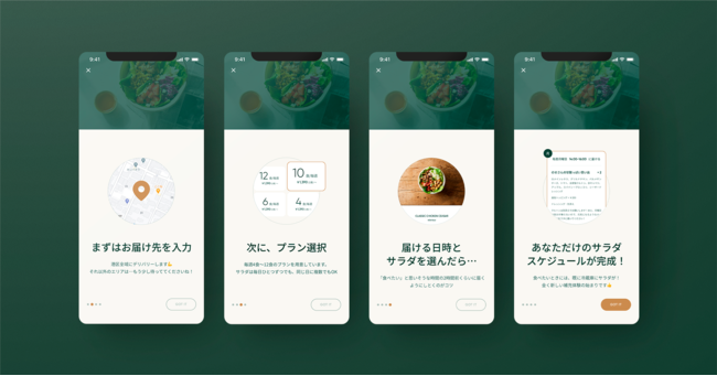 アプリからあなたが選んだカスタムサラダが、毎日おうちやオフィスに配送料無料で自動的に届きます。もちろんお店で買うときと一緒で、あなたのためだけに作るできたてのサラダです。違うサラダを食べたいときや届ける日時の変更、プランのスキップやキャンセルも週単位でアプリからカンタン。