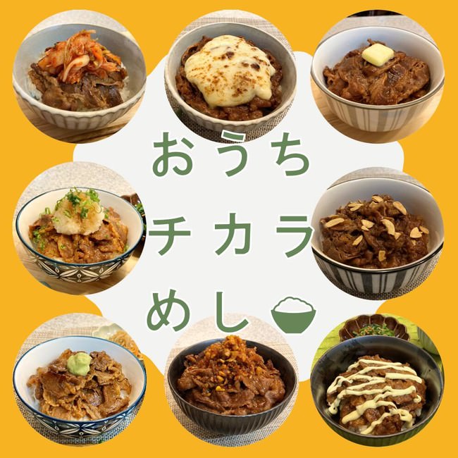 元祖焼き牛丼・旨辛キムチ焼き牛丼 ・濃厚2種のチーズ入り焼き牛丼 ・たっぷり葱と温泉卵の焼き牛丼 ・香ばし高菜の焼き牛丼 ・とろろたっぷり焼き牛丼 ・とろ~り玉子の焼き牛丼
