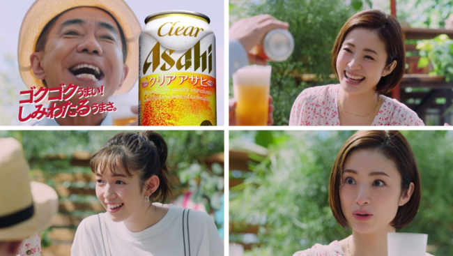 今回のTVCMは、木梨さんの別荘に佐藤さんと上戸さんが招かれ、和気あいあいと『クリアアサヒ』を飲んで楽しむ様子を描いています。久しぶりに『クリアアサヒ』を飲む上戸さんが「クリアって、こんなにおいしかったっけ」と驚いて感動し、その様子を見ていた木梨さんと佐藤さんが相づちをうちながら『クリアアサヒ』を味わいます。3人の幸せそうな表情と“ゴクゴクうまい!しみわたるうまさ。”というメッセージで『クリアアサヒ』のおいしさを表現しています。おいしさのあまり、3人で『クリアアサヒ』と歌いだしてしまうシーンなどを通じて『クリアアサヒ』の飲用喚起を図ります。
