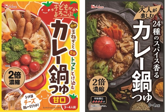 ハウス食品は、「子どもがよろこぶ 炒め玉ねぎと完熟トマトとけ込むカレー鍋つゆ」と「大人が楽しむ 24種のスパイス香るカレー鍋つゆ」を、8月9日からスーパーなどで発売します。子ども向けは炒め玉ねぎのコクと完熟トマトの旨みを加えた甘口の風味、大人向けは24種のスパイスが織りなす香り高い風味です。2倍濃縮で、内容量はどちらも425g、オープン価格(税別参考小売価格300円)。