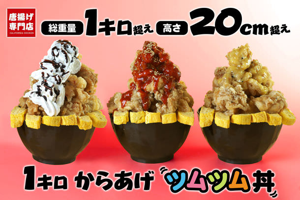 当店ではデカ盛りメニュー「1キロからあげ ツムツム丼」を7月20日に発売します。通常の3人前以上の量になる総重量1キロ越え、高さ20センチ越え、ごはん500g、自家製出し巻き10本、24時間秘伝のたれに付け込んだからあげ14個を高く積み上げたデカ盛りからあげ丼です。