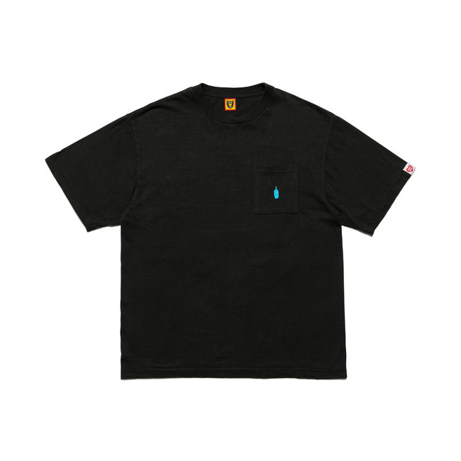 HUMAN MADEオリジナルのスラブ糸を使用した定番の丸胴ボディーTシャツ。ブラックカラーのTシャツのポケットには、ブルーボトルコーヒーのロゴを刺繍し、 背中には「BLUE BOTTLE COFFEE」の文字を染み込みプリントしました。腕にはHUMAN MADEのタグをつけています。