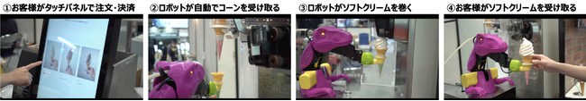 同ロボットは長崎ハウステンボスやポッポ イトーヨーカドー幕張店で稼働しているロボットです。一定期間の習熟が必要とされるソフトクリームの巻き作業を自動化することで、ボタン一つで品質の安定した商品を提供することができます。