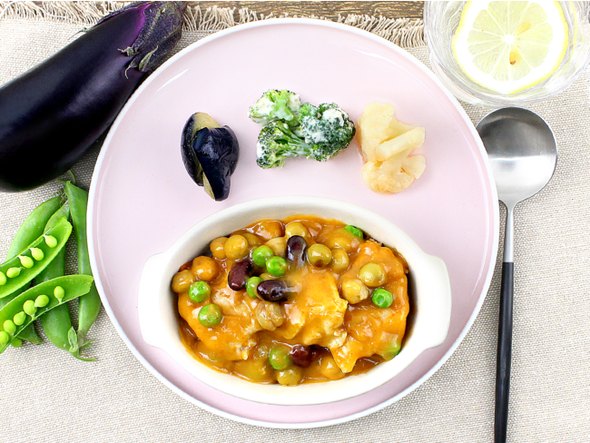 タイ料理の一つである、レッドカレーをご用意いたしました。香辛料やハーブを使用した本格的なレッドカレーとなっており、具材はシンプルなローストチキンとミックスビーンズ、彩りにグリーンピースを散らして仕上げております。刺激的な辛さと香辛料の香りは食欲を引き立てます。