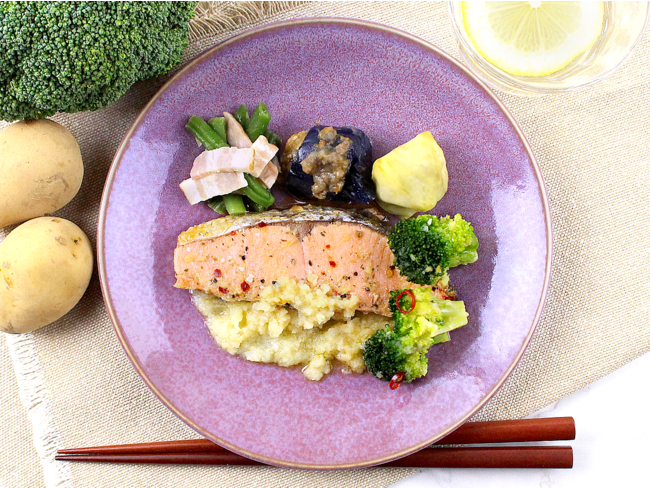 銀鮭が入ったアヒージョに、コンソメ味のマッシュポテトと明太子味のブロッコリーを合わせました。アヒージョには珍しいマッシュポテトを入れる事により、オイルの量を少なくしてあるのが、ナッシュ風です。鮭に含まれる脂溶性ビタミンはオイルとともに摂取することで吸収が良くなります。オリーブオイルににんにくを効かせた旨味たっぷりの銀鮭をお楽しみ下さい。