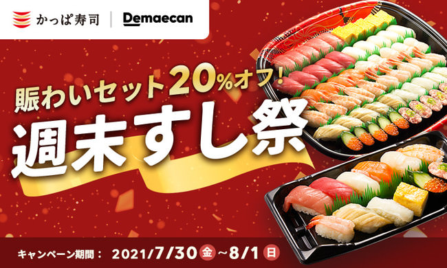 コロワイドグループのかっぱ寿司(カッパ・クリエイト㈱ 本社:神奈川県横浜市 代表取締役社長 田邊公己)は、出前サービス「出前館」(運営:株式会社出前館)が開催する「週末すし祭」キャンペーン【開催期間2021年7月30日(金)~8月1日(日)】に参加いたします。
