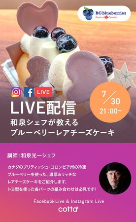ライブ配信ではカナダ・BC州産の良質な冷凍ハイブッシュ・ブルーベリーを用いて、東京・代々木上原「ASTERISQUE(アステリスク)」オーナーシェフの和泉光一氏がBCブルーベリー協会のために開発したオリジナルレシピのブルーベリー レアチーズケーキをご紹介します。