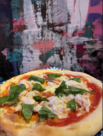 トマトとサラダをベースにした夏にぴったりの爽やかなピザに、たっぷりのカニをのせた贅沢な一品。 冷えたワインと一緒にお楽しみください。