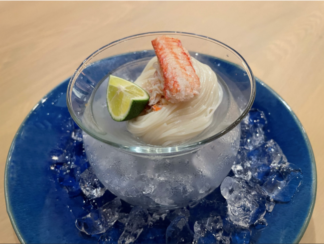 ライムの香りが爽やかで、食欲をそそる冷たい素麺と毛蟹のマリアージュは、スパークリングワインとの相性も抜群です。