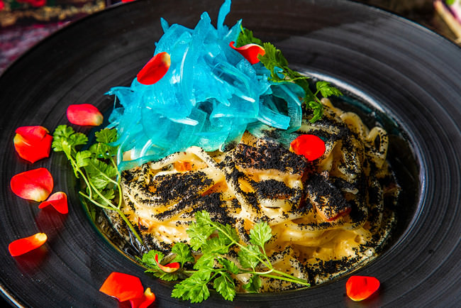 純真無垢な乙女心に忍び寄る漆黒の魔物の気配…そんな想像すら掻き立ててしまう一皿は、濃厚なチーズとベーコンの塩気の塩梅が絶妙なソースで、気づけばフォークで巻き取るのももどかしいほど食欲をそそられてしまう❝魔性のパスタ❞。レイジを思わせるブルーに染まった玉ねぎが、味のアクセント。
