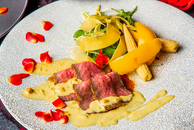 国産和牛のタリアータ黒トリュフ薫るペリグーソースと雲丹とサフランのクリームソース