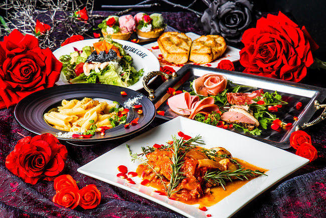 「サーモンとアボカドのコブサラダ」や「ナッツのアンチョビのガーリックトースト」など、VAMPIRE CAFE 定番人気メニューに加え、「鶏モモ肉とキノコのトマト煮込み カチャトーラ」など、このコースのためだけに創られたメニューもあり、実は❝オイシイとこ取り❞なラインナップのフルコースです。