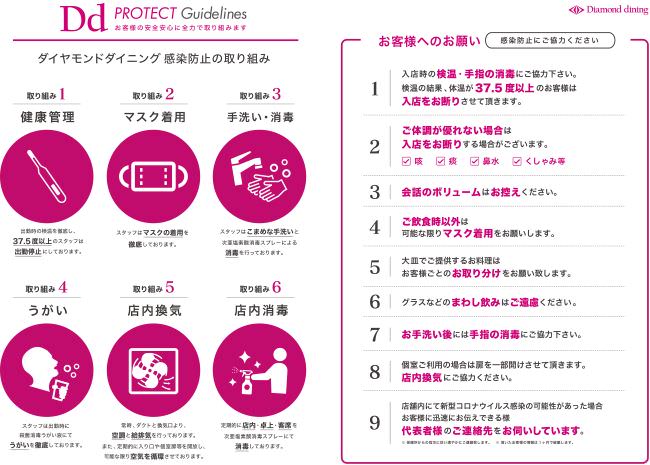 株式会社ダイヤモンドダイニングが運営する各店舗では、お客様に安心してお食事を楽しんでいただくため、行政が定める方針に基づいた感染防止対策を最大限に講じ「Dd PROTECT Guidelines」として実施しております。