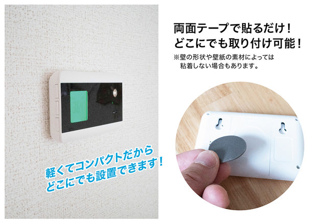 検温にあたって設定等は一切不要。両面テープで設置したい場所に貼るだけなので、簡単に運用を開始できます。背面の吊り下げ穴にフックやネジの頭を固定することで、壁掛け設置も可能です。
