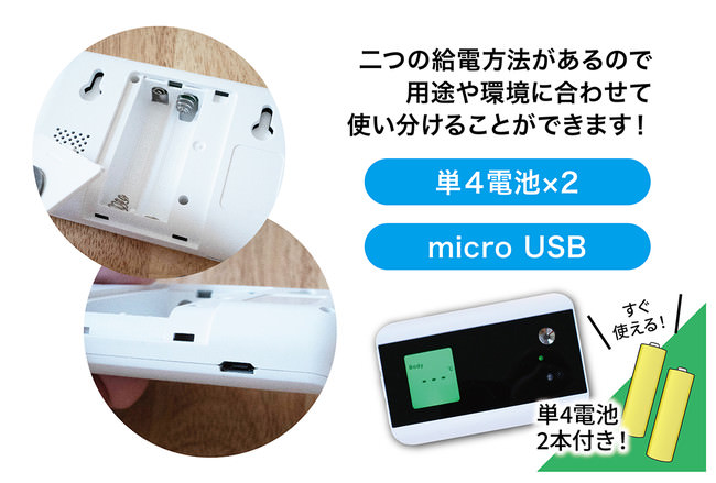 本製品は単4電池、もしくはmicro USBにて給電ができ、用途や環境に合わせて給電方法を使い分けることができます。単4電池は納品時に付属されています。