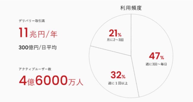中国のデリバリー市場には4億6000万人のアクティブユーザーがおり、ユーザーの約半数が週に3回以上デリバリーを使っています。毎日平均300億円の取引が行われており、2019年の総取引額は11兆円にも登っており、市場はさらに拡大を続けています。