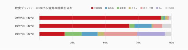 また、中国の若者の食生活は多様化しており、デリバリー市場においても、これまで中華料理一辺倒だった飲食デリバリー消費にも変化が起こっています。20代を中心に海外の料理やスイーツ類などが好まれるようになっており、若者は新鮮な刺激を求めていることが伺えます。