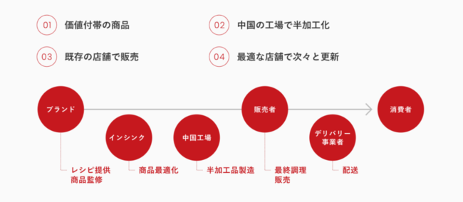 「GENU」は、日本の飲食ブランドが磨き上げた価値あるレシピを、料理の素材やパーツごとに分解し、中国の工場で半加工品を製造。その半加工品を既存の加盟飲食店が仕入れて最終調理し、普段通りのデリバリースキームに乗せて消費者のもとに配達します。